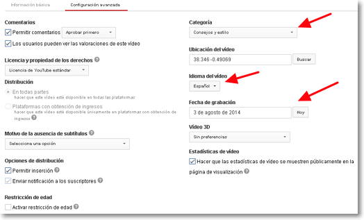 Otros datos que puedes introducir es la ubicación del vídeo, el idioma y la fecha de grabación.