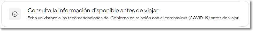 Con la actual pandemia de Covid-19 tardaremos algún tiempo en volver a realizar viajes y vuelos, así como reservar hoteles en nuestro destino preferido, por ello en la misma página de Google Viajes encontramos un recuadro de diálogo que indica la necesidad de informarse con las recomendaciones del Gobierno sobre el coronavirus antes de viajar.
