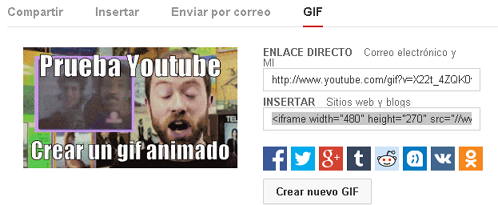 El resultado es una url de Youtube (se le añada el término gif a la propia url de Youtube) que podrás compartir por correo y además te proporcionará un código iframe para insertar la imagen donde desees.