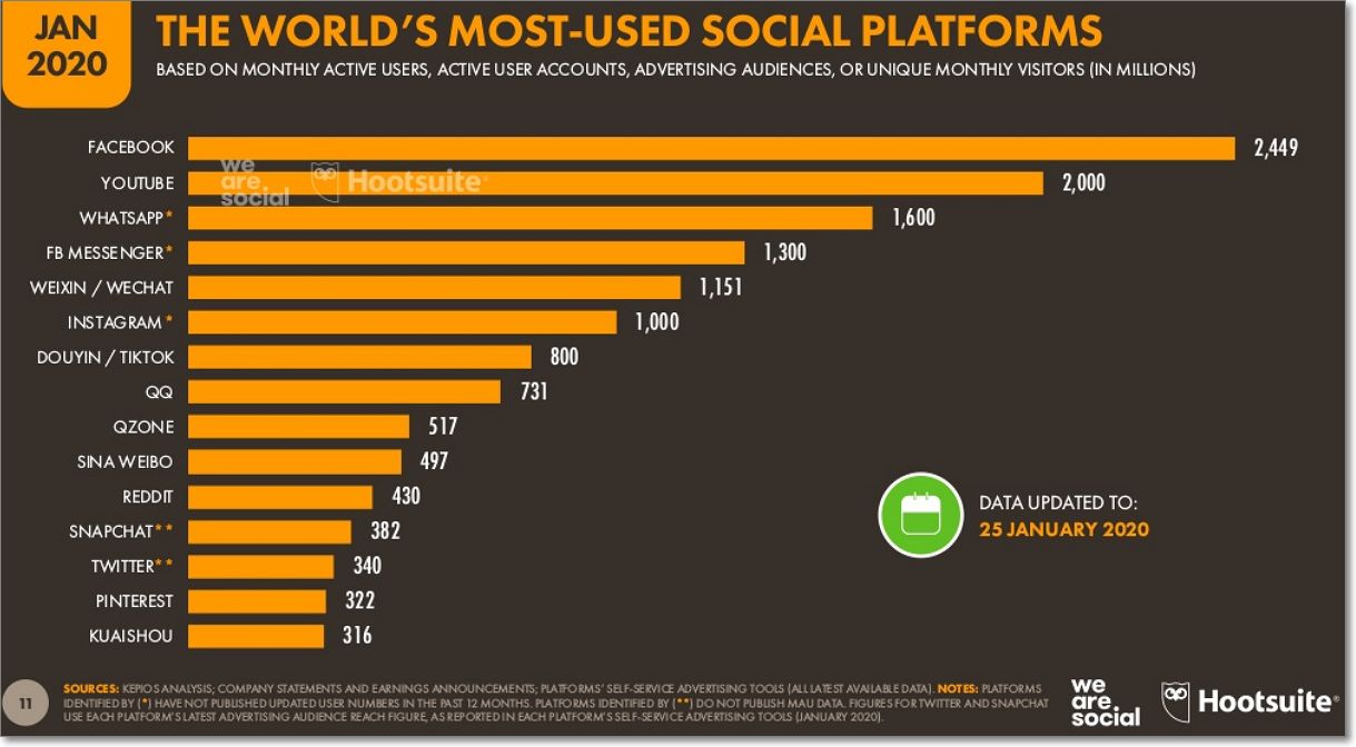 A nivel mundial es Facebook la red social más utilizada seguida de Youtube y WhatsApp.