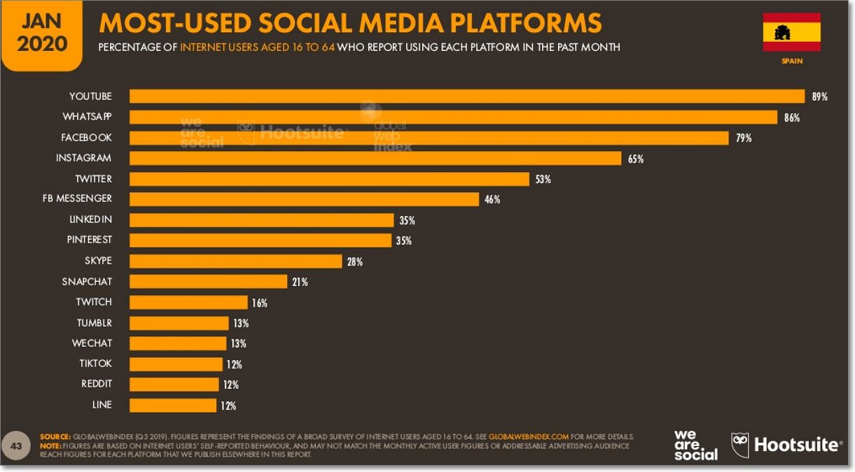 Un informe recién elaborado #Digital2020 por la agencia creativa We Are Social junto a la plataforma para gestionar redes sociales Hootsuite indica que es Youtube la red social más utilizada en España.